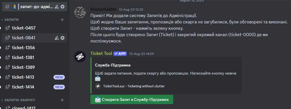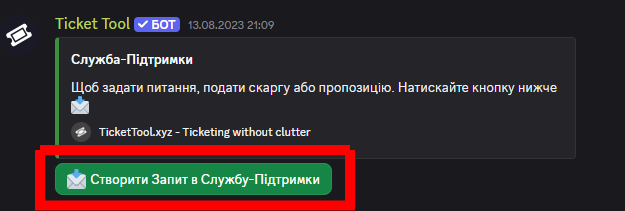 Щоб створити Запит - нажміть зелену кнопку. Після цього буде створено Запит (Ticket) і закритий окремий канал (ticket-0000) де ми поспілкуємося.