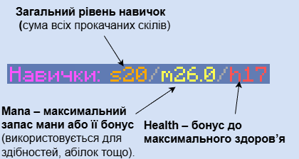 Навички покращують ваші здібності в різних видах діяльності. Чим вищий рівень навички, тим кращі бонуси ви отримуєте. Прокачуйте навички, виконуючи відповідні дії.